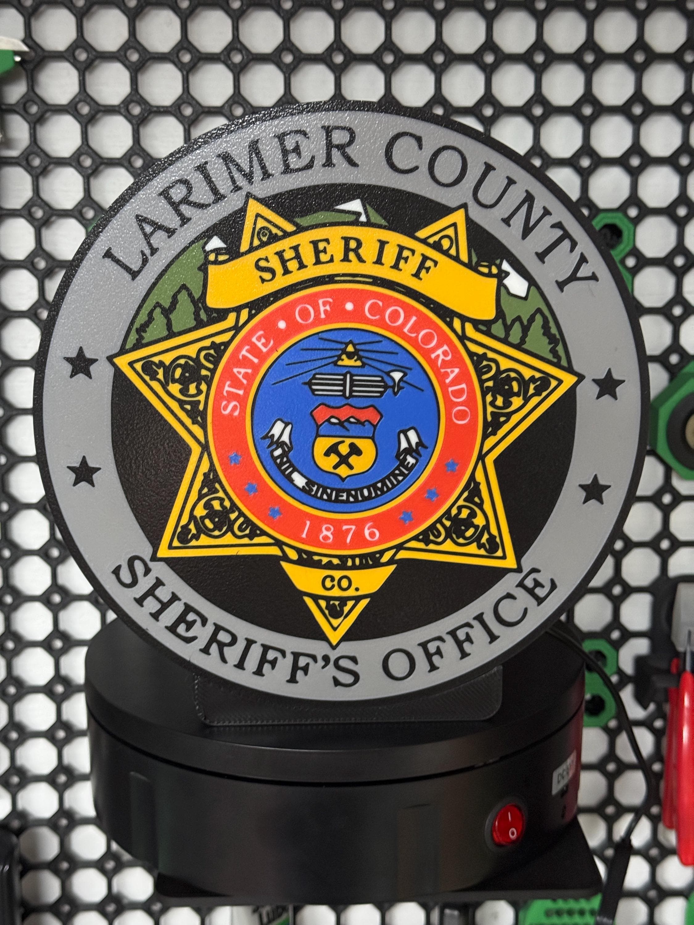 This item is an artistic homage to the Larimer County Sheriff's Office and is intended for collection and display purposes only. It does not provide any official or enforcement capabilities.